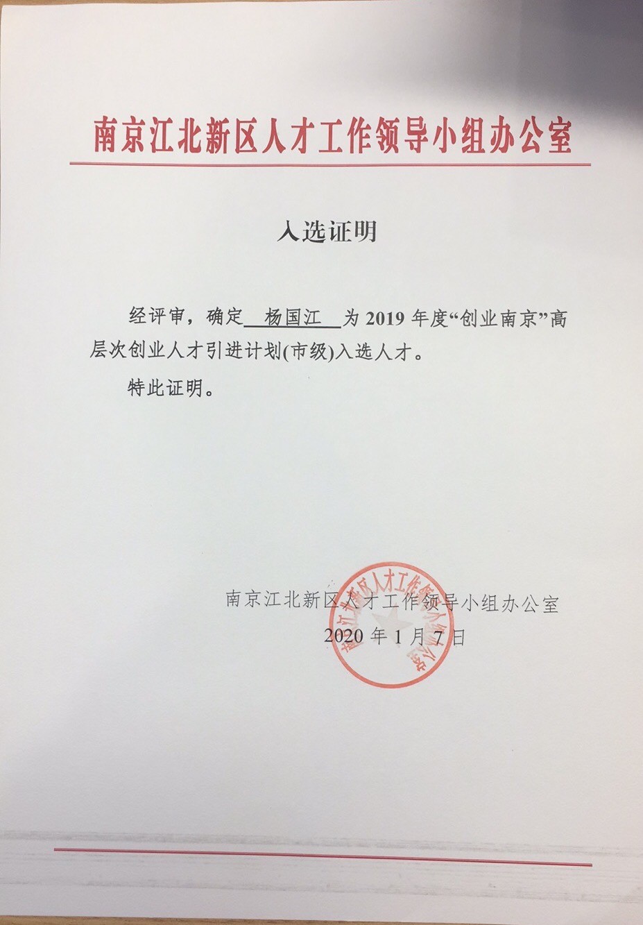 2020年1月7日,经区级和市级的层层评审,公司杨国江董事长正式被认定为2019年度“创业南京”高层次人才引进计划(市级)入选人才。